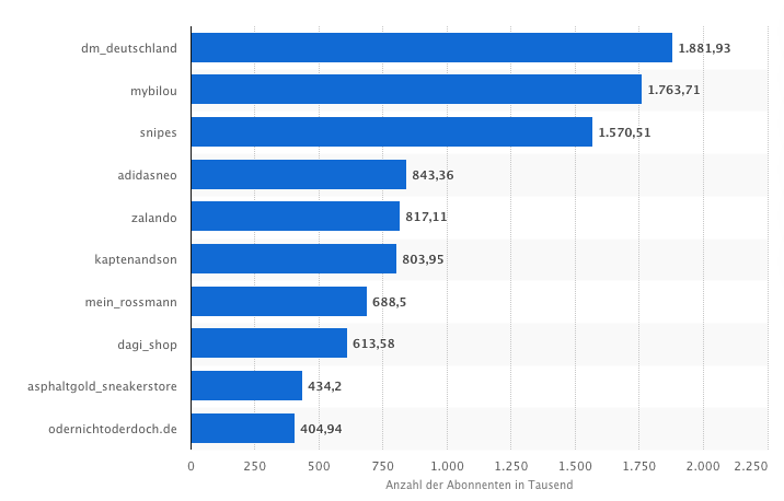 Quelle: https://de.statista.com/statistik/daten/studie/427354/umfrage/top-10-beliebteste-deutsche-unternehmen-auf-instagram-nach-anzahl-der-follower/