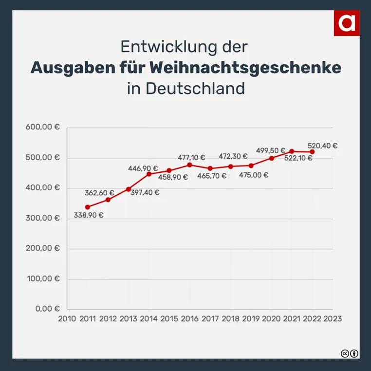 komme, was wolle, an einer Sache wird in Deutschland nicht gespart. Das sind – Sie ahnen es bereits – die Weihnachtsgeschenke. Ein Blick auf die folgende Grafik zeigt, dass die Ausgaben für Präsente im Laufe der letzten 11 Jahre um fast 54 Prozent gestiegen sind. Damit gab jeder Deutsche 2022 im Schnitt 520,40 Euro für bunte Päckchen und strahlende Gesichter unterm Baum aus.