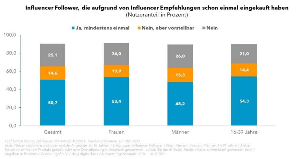 Demnach hat jeder zweite Follower schon mindestens einmal ein Produkt erworben, das ein Influencer zuvor empfohlen hatte. Vor allem Frauen zwischen 16 und 39 Jahren sind empfänglich für die Shopping-Tipps der Meinungsmacher.