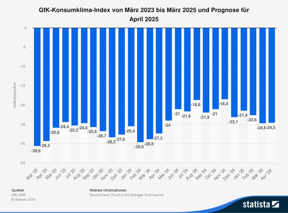 nach dem verhaltenen Jahresbeginn hat sich die Konsumlaune in Deutschland auf niedrigem Niveau stabilisiert. Für April 2025 prognostiziert der GfK-Konsumklima-Index einen leichten Anstieg auf -24,5 Punkte. Auch Kaufbereitschaft und Konjunkturerwartungen zeigen einen vorsichtigen Aufwärtstrend.