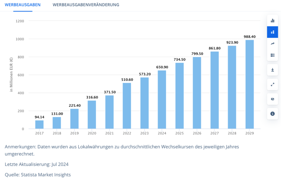 Die deutschen Unternehmen haben die Zeichen der Zeit erkannt: Influencer-Werbung wächst weiter stark. Statista prognostiziert für das Jahr 2024 Ausgaben von über 650 Millionen Euro für Influencer Marketing. Pro Nutzer sollen durchschnittlich 9,14 Euro in Influencer Marketing investiert werden. Für 2029 wird ein Marktvolumen von über 988 Millionen Euro erwartet. Weltweiter Spitzenreiter beim Werbeumsatzvolumen 2024 ist China mit knapp 18 Milliarden Euro.