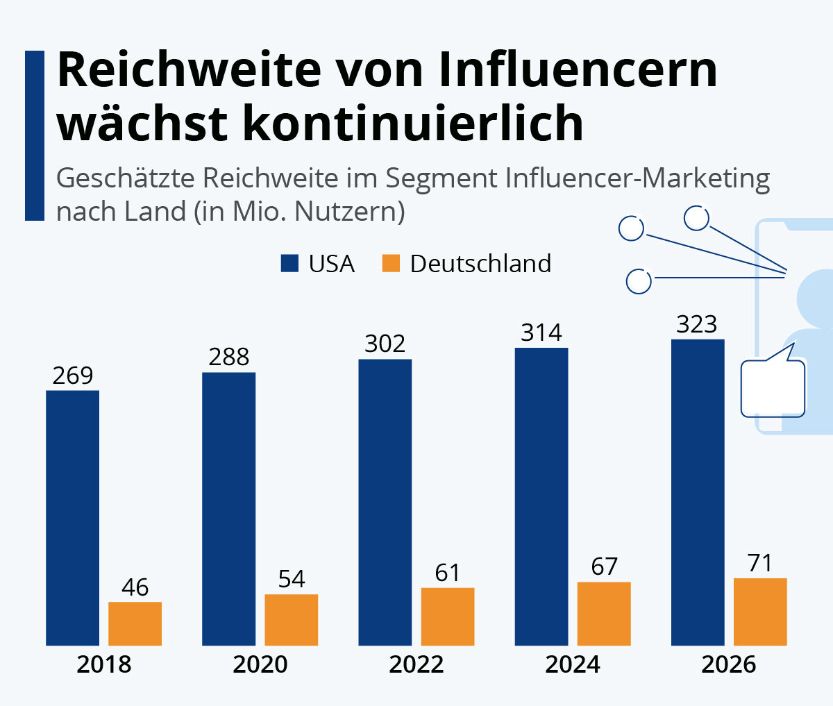 wie hoch ist der Einfluss der Influencer? Genau weiß es auch das Unternehmen Statista nicht – darum basiert die aktuelle Statistik zum Thema auf geschätzten Zahlen. Glaubt man diesen, erreichen Influencer hierzulande 61 Millionen Menschen. 2026 könnten es schon 71 Millionen sein.