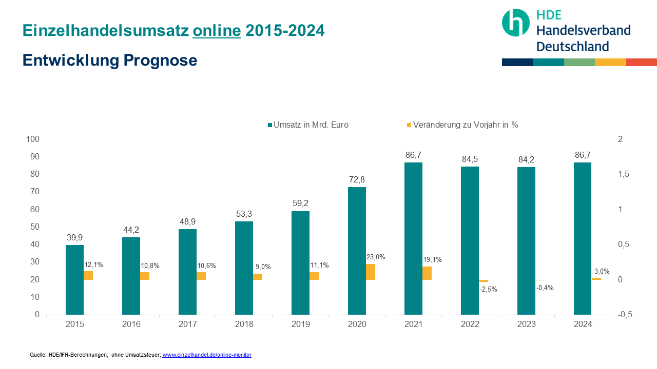 nachdem der Online-Handel jahrelang rasant zulegte und während der Corona-Pandemie praktisch durch die Decke ging, schrumpften die Umsätze in den Jahren 2022 und 2023 erstmalig – wenn auch nur minimal. Nun ziehen die Geschäfte offenbar wieder an: Für das Jahr 2024 rechnet der Handelsverband Deutschland (HDE) mit E-Commerce-Umsätzen in Höhe von 86,7 Milliarden Euro. Stimmt die Prognose, würden die Umsätze damit nominal um 3,0 Prozent im Vergleich zum Vorjahr steigen.